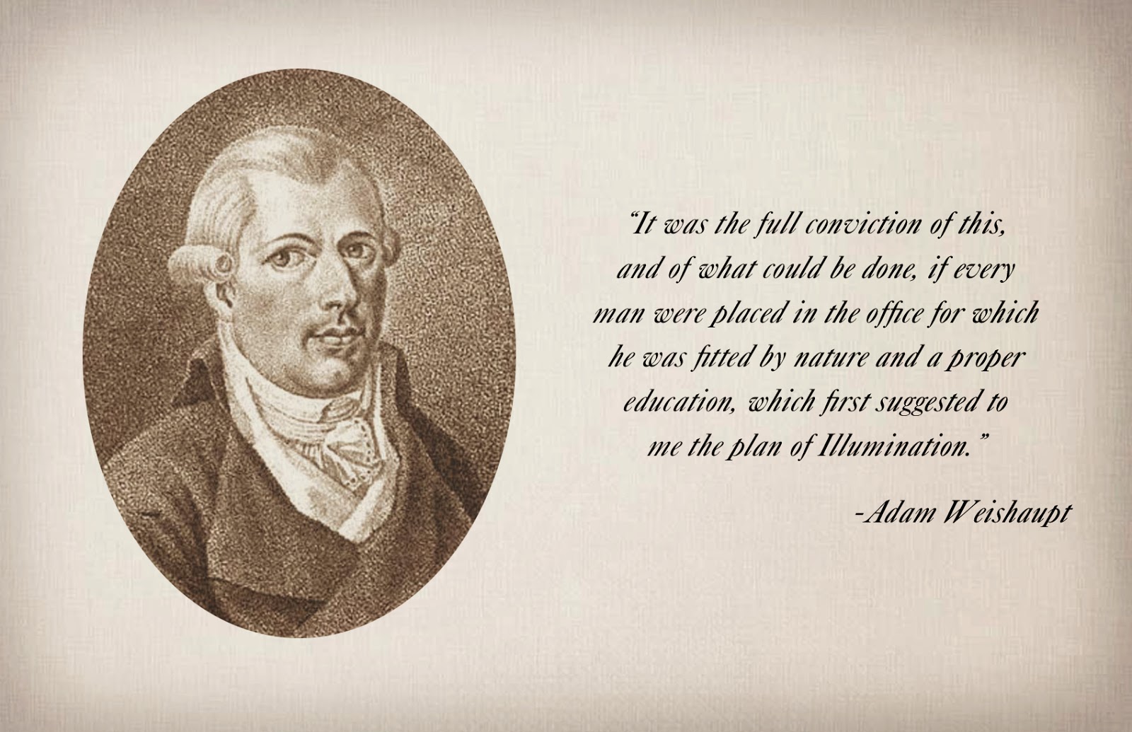 «(...) Adam Weishaupt nasceu a 6 de Fevereiro de 1748, em Ingostadt; em criança, foi educado pelos padres jesuítas, que nele instilaram não só a discrição, como também o respeito pela obediência hierárquica da Companhia de Jesus (ou Jesuítas). Contudo, a despeito dessa precoce ligação à ordem, a sua nomeação, em 1775, como professor de Direito Natural e Direito Canónico na Universidade de Ingolstadt enfureceu os seus professores, pois não só acaba por vir a perfilhar graves pontos de vista liberais e cosmopolitas, como também "condenava o fanatismo e os padres supersticiosos". Contudo, nem todos estavam contra ele, pois não precisaria de muito tempo para conquistar uma boa reputação entre estudantes e professores e até elementos das universidades vizinhas se sentiam impressionados com os seus ensinamentos. Talvez esse apoio tivesse transmitido confiança a Weishaupt, o que, sem dúvida , conduziu à sugestão de vir a tornar-se dirigente de um grupo mais influente.