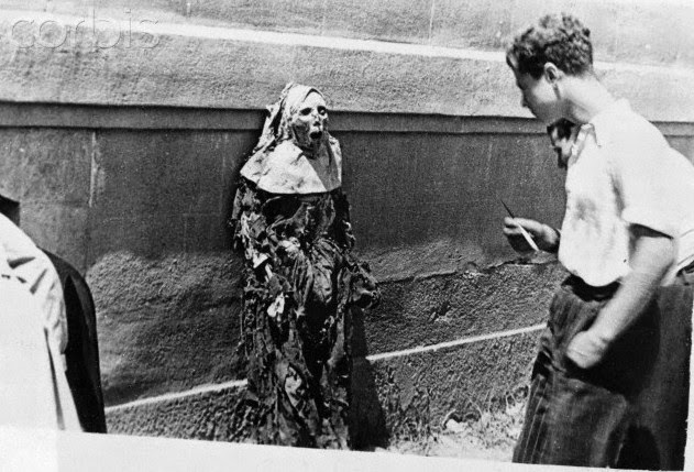 | Cadáveres profanados e dispostos numa rua de Barcelona durante a Guerra Civil Espanhola. |