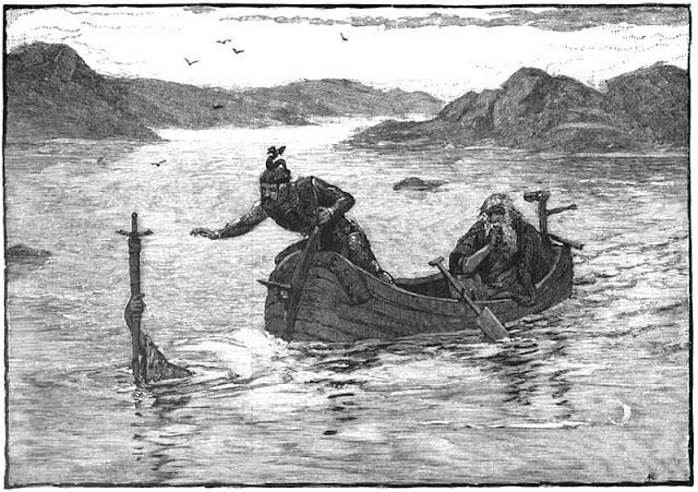"Aquela é a Dama do Lago", disse Merlin, "e no fundo do lago há uma rocha e uma gruta, e aí há um lugar tão belo e aprazível como se fosse em terra e ricamente acomodado. E esta donzela virá em seguida até vós; falai-lhe então gentilmente para que ela vos dê a espada".
